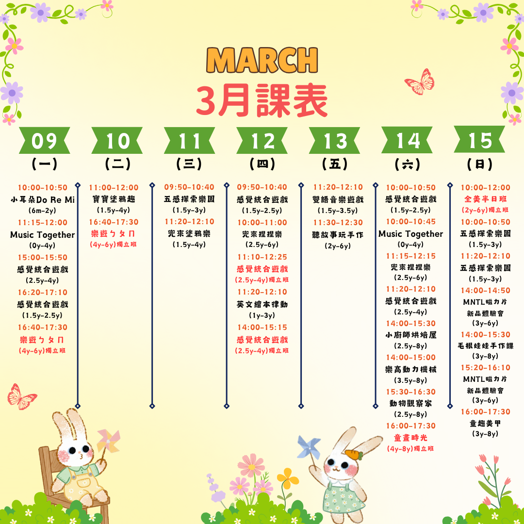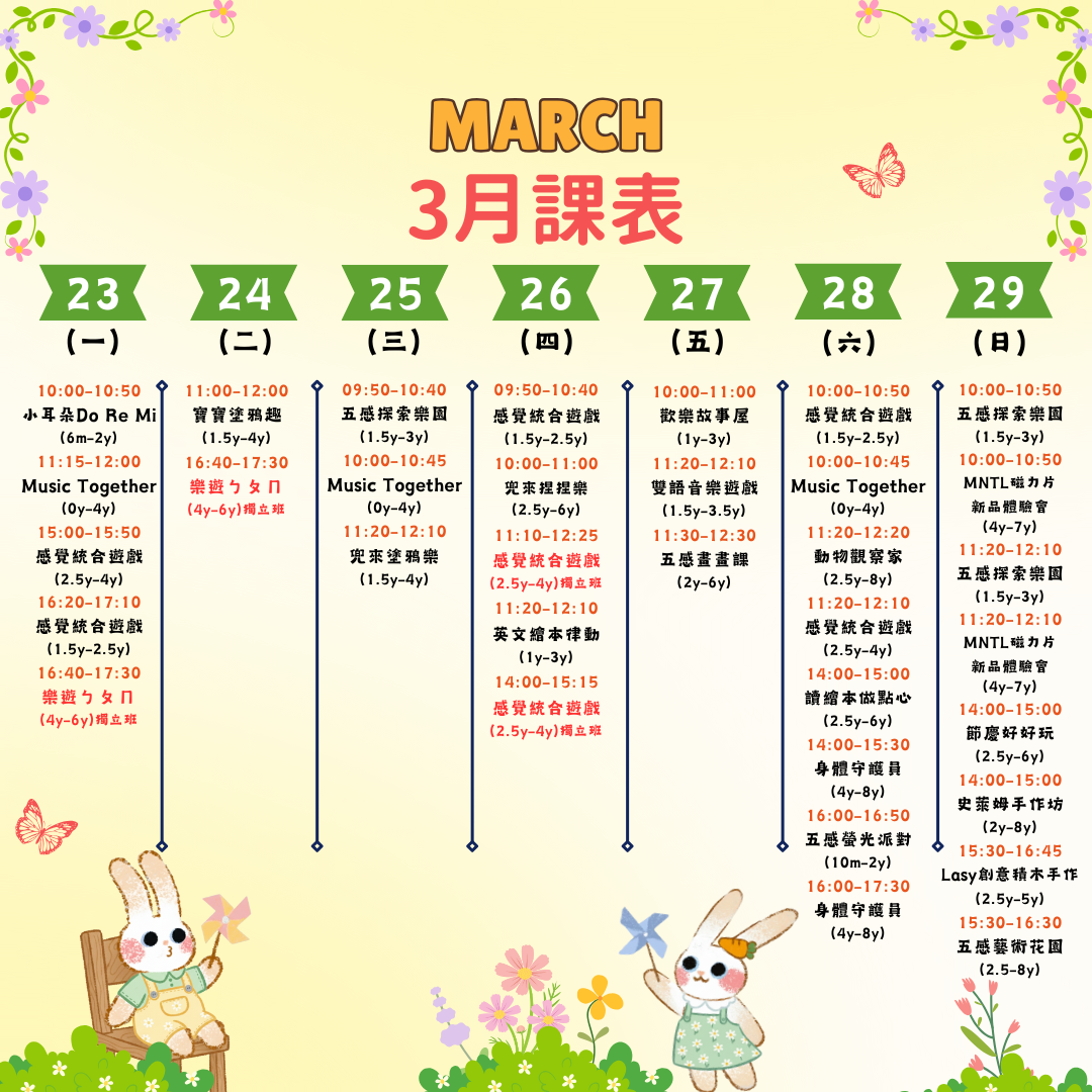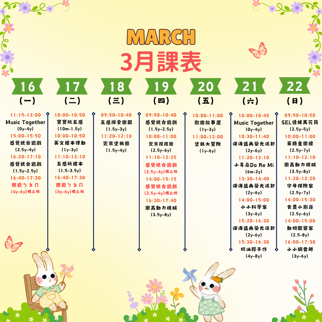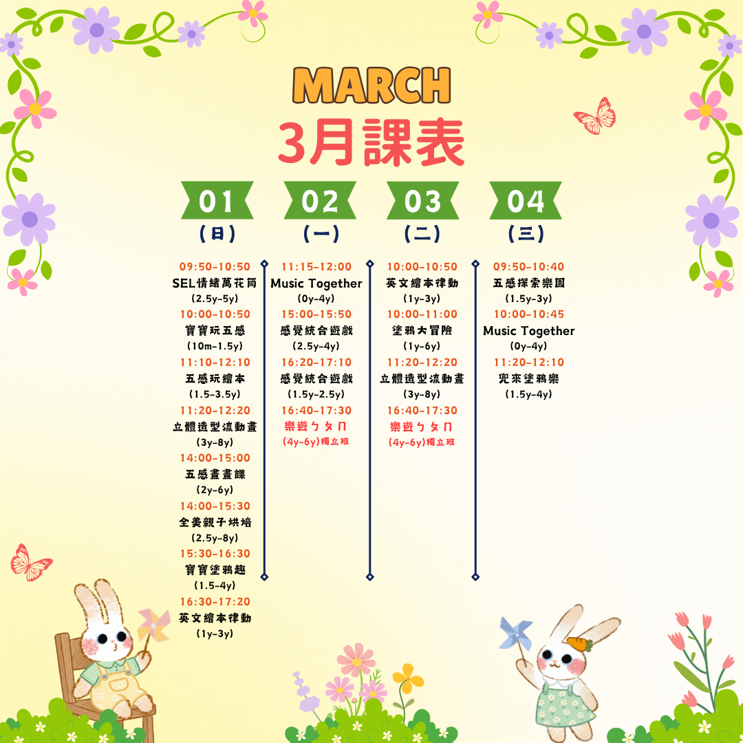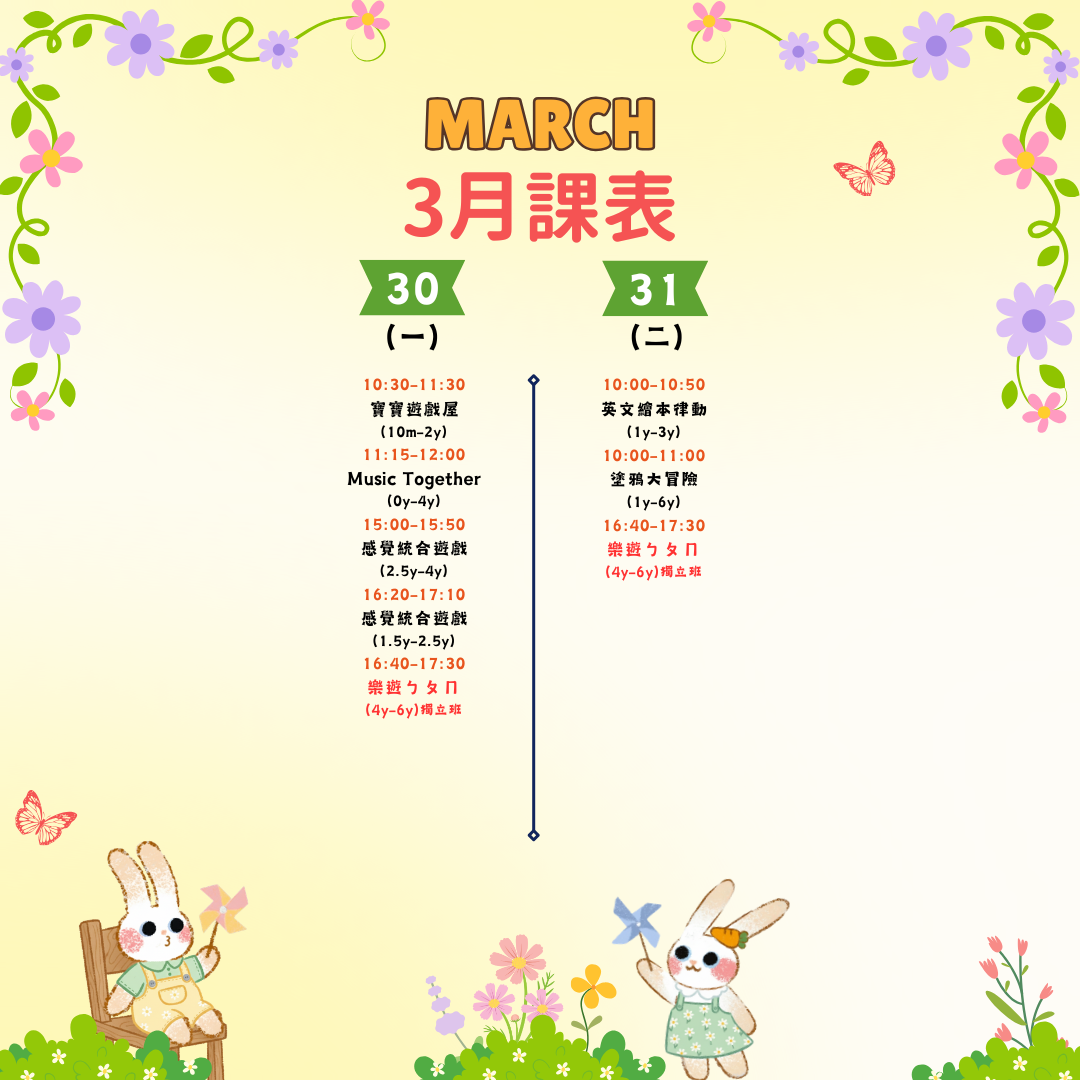 這週在兜樂玩什麼呢? 3/30 ~ 3/31 週一 MON 週二 TUE 寶寶遊戲屋|10個月-2歲 $960/4點 60 分 立即預約 特價 Music Together-春季班|0-4歲 NT$800 NT$720 45 分 立即預約 感覺統合遊戲大寶班 |2歲半-4歲 $720/3點 50 分 立即預約 感覺統合遊戲小寶班 |1歲半-2歲半 $720/3點 50 分 立即預約 英文繪本律動|1歲-3歲 $960/4點 50 分 立即預約 塗鴉大冒險|1歲-6歲 $720/3點 60 分 立即預約