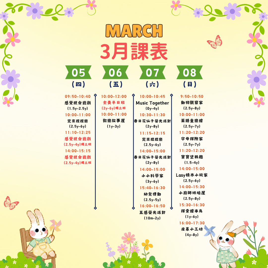 這週在兜樂玩什麼呢? 3/5 ~ 3/8 週四 THU 週五 FRI 週六 SAT 週日 SUN 感覺統合遊戲小寶班 |1歲半-2歲半 $720/3點 50 分 立即預約 兜來捏捏樂|2歲半-6歲 $720/3點 60 分 立即預約 感覺統合遊戲獨立班|2歲半-4歲 $1200/5點 75 分 立即預約 全美半日班|2歲-6歲 $1440/6點 2 小時 立即預約 歡樂故事屋|1-3歲 $960/4點 60 分 立即預約 特價 Music Together-冬季班|0-4歲 NT$800 NT$720 45 分 立即預約 春日花仙子螢光派對|2-8歲 $1200/5點 60 分 立即預約 兜來捏捏樂|2歲半-6歲 $720/3點 60 分 立即預約 小小科學家|3歲-6歲 $960/4點 60 分 立即預約 幼兒律動|2歲半-5歲 $720/3點 50 分 立即預約 五感螢光派對|10個月-2歲 $960/4點 50 分 立即預約 動物觀察家|2歲半-8歲 $960/4點 60 分 立即預約 英語童樂繪 Read & Play|2歲半-7歲 $1200/5點 60 分 立即預約 字母探險家 ABC Explorers|2歲半-7歲 $1200/5點 60 分 立即預約 寶寶塗鴉趣|1歲半-4歲 $720/3點 60 分 立即預約 LASY積木小玩家|2歲半-6歲 $960/4點 60 分 立即預約 小廚師烘焙屋|2歲半-8歲 $960/4點 90 分 立即預約 探索繪本島|1歲-6歲 $960/4點 50 分 立即預約 皮革小工坊|4歲-8歲 $1680/7點 90 分 立即預約