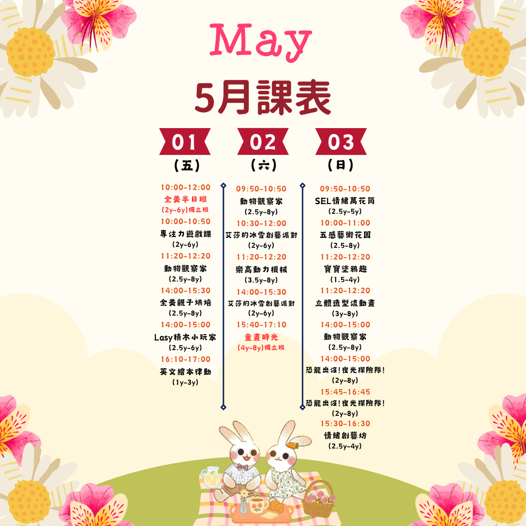 這週在兜樂玩什麼呢? 5/1 ~ 5/3 週五 FRI 週六 SAT 週日 SUN 全美半日班|2歲-6歲 $1440/6點 2 小時 立即預約 專注力遊戲課|1歲8個月-6歲 $720/3點 50 分 立即預約 動物觀察家|2歲半-8歲 $960/4點 60 分 立即預約 全美親子烘焙|2歲半-8歲 $1200/5點 90 分 立即預約 LASY積木小玩家|2歲半-6歲 $960/4點 60 分 立即預約 英文繪本律動|1歲-4歲 $960/4點 50 分 立即預約 動物觀察家|2歲半-8歲 $960/4點 60 分 立即預約 艾莎的冰雪創藝派對|3歲-8歲 $1440/6點 90 分 立即預約 樂高動力機械|3歲半-8歲 $960/4點 60 分 立即預約 童畫時光|4歲-8歲(獨立班) $960/4點 90 分 立即預約 SEL情緒萬花筒|2歲半-5歲 $720/3點 60 分 立即預約 五感藝術花園|2歲半-8歲 $1440/6點 60 分 立即預約 寶寶塗鴉趣|1歲半-4歲 $720/3點 60 分 立即預約 立體造型流動畫|3-8歲 $960/4點 60 分 立即預約 動物觀察家|2歲半-8歲 $960/4點 60 分 立即預約 恐龍出沒!夜光探險隊! |2-8歲 $1200/5點 60 分 立即預約 情緒創藝坊|2歲半-4歲 $960/4點 60 分 立即預約