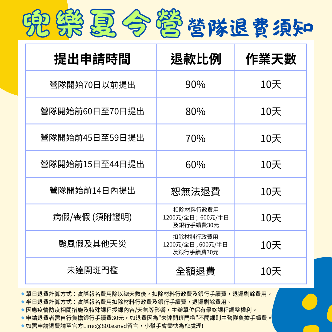 .若遇不可抗力之天然災害及傳染性疾病等因素,原則依行政院人事行政局公告各縣市停班、課狀況,將以LINE通知當日課程是否取消,受影響之營隊課程活動將扣除材料行政費用1200元/天及銀行手續費30元後,其餘費用依天數比例退還;若上午營隊活動正在進行,下午發佈停班停課,本公司將斟酌學員安全狀況處理,若活動需提前結束,受影響之營隊課程活動將扣除材料行政費用600元/天及銀行手續費30元後,其餘費用依天數比例退還。